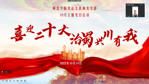 为深入贯彻习近平总书记来川视察重要讲话精神,落实中省市委和公司党委要求,按照“政治引领、标准提升、基础规范”的工作思路,太阳集团tcy8722党总支于2022年10月14日举行了“喜迎二十大·治蜀兴川有我”主题党日活动,全体教师党员参加了本次活动,本次主题党日活动通过线上进行。