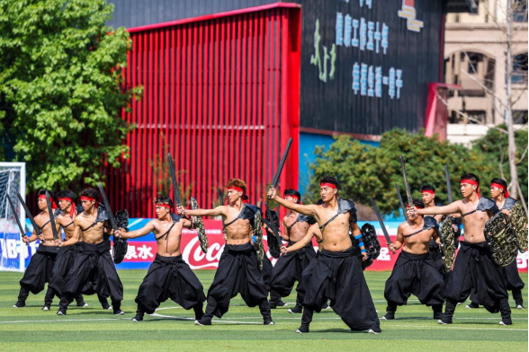 开场环节,《板楯蛮》表演震撼亮相:刚劲舞姿诠释地域文化底蕴,铿锵鼓点传递传统精神力量,精彩呈现赢得观众掌声不断;中场休息时,《啦啦操》表演点燃全场:整齐动作展现学子昂扬姿态,饱满热情感染在场每一位观众,活力风采为运动员注入全新动力。
