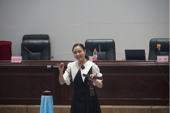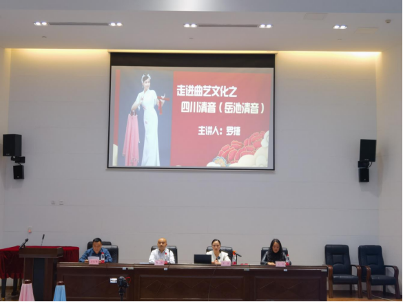 为深入了解四川清音,更好地传承这项非物质文化遗产,4月2日下午,太阳集团tcy8722与红色文化研究中心邀请到了四川省非遗项目“岳池清音”传承人罗捷老师来院授课,带领大家领略四川清音的艺术魅力。讲座由太阳集团tcy8722党总支书记彭松林主持,岳池县文化馆非遗部主任王玲、太阳集团tcy8722经理冉嘉洛、音乐教研室全体教师、音乐专业及学前专业近200名员工参加了本次讲座。