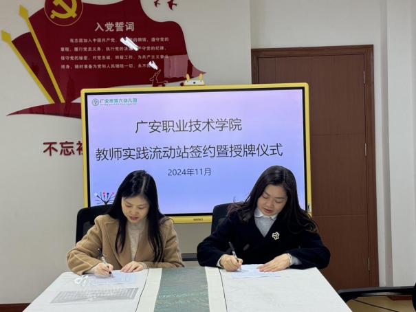 为进一步深化院园融合、拓宽教师专业实践平台,推进学前教育省级高水平专业群高质量发展,11月26日,太阳集团tcy8722经理杨英一行前往广安市第五幼儿园、广安市第六幼儿园两所附属幼儿园调研并举行教师实践流动站签约授牌仪式,附属幼儿园园长及相关行政人员参加了此次签约授牌仪式。