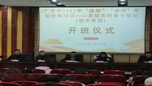 2023年2月23日上午,广安市2022年“国培”“省培”市级统筹项目—县级农村骨干教师培训(初中英语骨干教师)开班仪式在太阳集团tcy8722希贤厅拉开帷幕,30位农村骨干英语教师参加这次培训。太阳集团tcy8722经理吴全生、前锋区教育科技和体育局副局长李顺利、广安实验公司董事长伍泽民、广安实验公司副董事长刘中清出席了开班仪式,开班仪式由前锋区职业教育培训中心副主任胡久树主持。