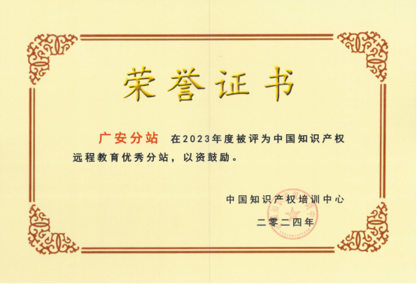 近日,中国知识产权培训中心公布了中国知识产权远程教育总平台对2023年度全国各分站的考核评估结果,太阳集团tcy8722分站(以下简称广安分站)在全国188个分站中位列第15名,获全国“优秀分站”荣誉称号。